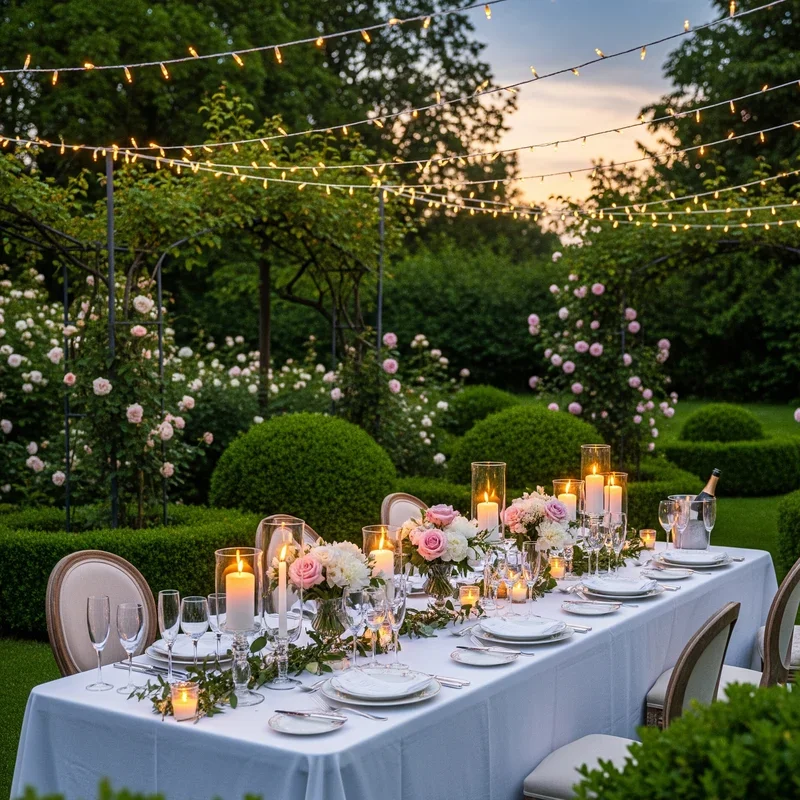 Transform an outdoor space into an enchanted garden where fairy lights meet fresh flowers in a celebration of natural beauty and enduring love! String bistro lights overhead, place lanterns along pathways, and use plenty of candles to create magical ambiance as dusk falls. Set up elegant seating areas with vintage furniture and lace tablecloths adorned with wildflower centerpieces. Include garden games like croquet or bocce ball for casual entertainment between courses. Serve a farm-to-table menu featuring seasonal ingredients and signature cocktails infused with fresh herbs from the garden. Create a champagne tower for dramatic toasts and photos that capture the evening's elegance. The outdoor setting provides natural beauty requiring minimal decoration while offering flexibility for both intimate moments and group celebrations. This timeless approach suits any anniversary milestone, feeling equally appropriate for young love or mature romance.