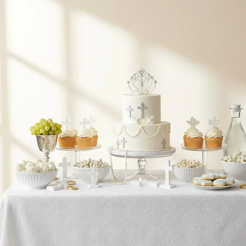 Transform your dessert table into a sweet testament of faith by incorporating religious symbols into every delicious detail. Picture cross-shaped cookies delicately iced in white and gold, cupcakes topped with fondant angels, and a magnificent baptism cake adorned with edible pearls resembling rosary beads. Arrange treats on tiered stands at varying heights to create visual interest, and include dove-shaped marshmallow pops or chocolate pretzels formed into praying hands. Add scripture verses on small cards next to each dessert, turning your sweet treats into meaningful reminders of the day's significance. Consider including traditional desserts from your cultural background, connecting the celebration to your family's heritage. This thoughtful approach transforms simple sweets into conversation starters that bring generations together while satisfying everyone's sweet tooth.