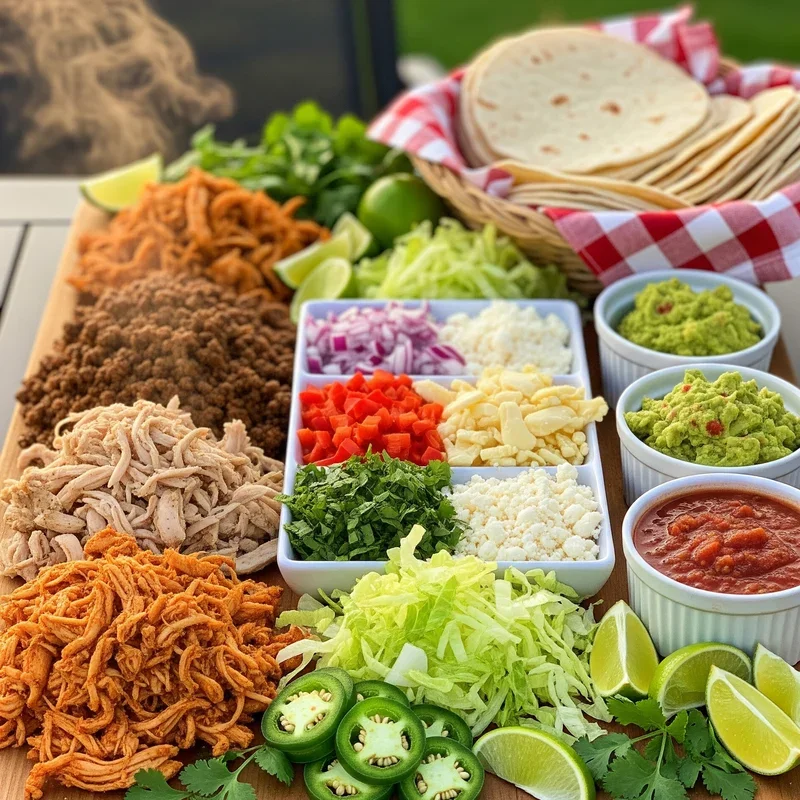 Build a DIY taco paradise that gets everyone involved. Arrange hard shells, soft tortillas, and lettuce cups in neat rows. Create sections for seasoned ground beef, shredded chicken, and black beans. Include classic toppings like shredded lettuce, diced tomatoes, and multiple cheese varieties. Add unexpected elements like pickled jalapeños, corn salsa, and lime crema. Provide both mild and spicy sauce options to accommodate different heat preferences. Include fresh cilantro, sliced radishes, and lime wedges for authentic touches. Don't forget tortilla chips with queso and guacamole on the side. This interactive board turns dinner into entertainment as guests create personalized combinations. The build-your-own concept reduces hosting stress while ensuring everyone gets exactly what they want.