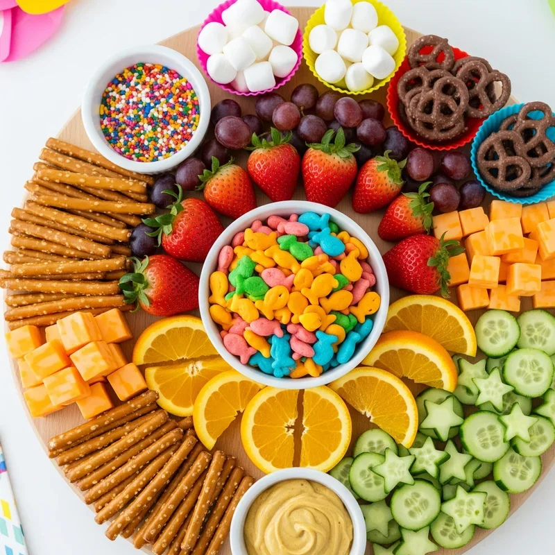 Design a playful display that makes healthy eating exciting for young guests. Create faces using fruit slices, vegetable sticks, and crackers. Include kid favorites like cheese cubes, mini pretzels, and goldfish crackers. Add colorful elements like rainbow fruit kabobs and veggie flowers. Incorporate dips like peanut butter, Nutella, and ranch for interactive eating. Use cookie cutters to shape sandwiches and cheese slices into fun forms. Include some treats like mini cookies or gummy bears in moderation. Arrange items at different heights using small cups and containers. This approach keeps kids engaged while parents appreciate the healthier options mixed with treats. The playful presentation turns snack time into an adventure.