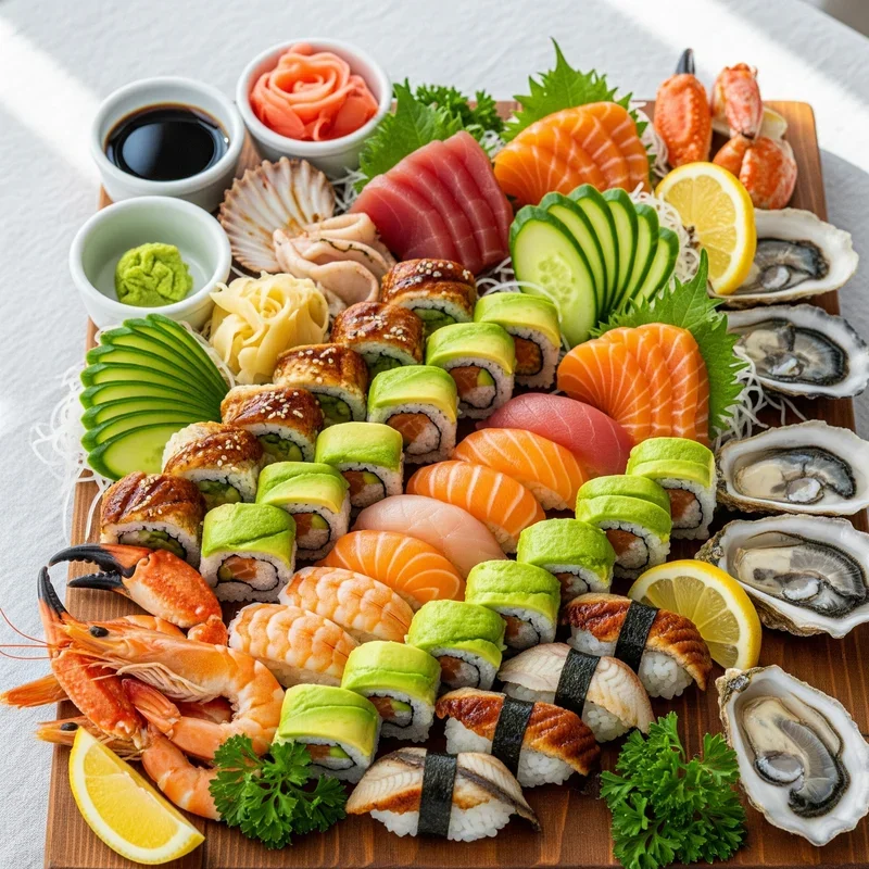 Elevate your party with an sophisticated oceanic display. Arrange sushi rolls, sashimi, and nigiri in precise patterns. Include cooked options like shrimp tempura and California rolls for raw fish skeptics. Add edamame, seaweed salad, and cucumber salad for refreshing sides. Provide pickled ginger, wasabi, and soy sauce in small dishes. Incorporate smoked salmon roses and cocktail shrimp for variety. Use bamboo leaves or shiso as decorative elements. Include chopsticks and small plates for authentic service. This upscale board impresses guests while offering lighter fare that won't weigh them down. The visual impact alone makes your party feel like a high-end restaurant experience without the hefty price tag.