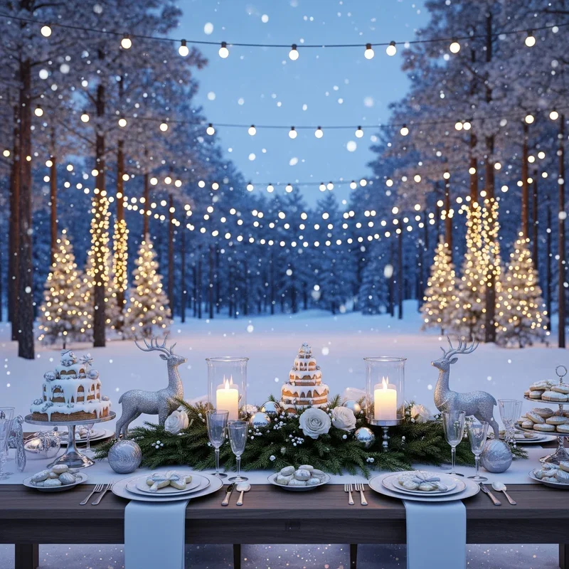 Transport your guests into a magical frozen kingdom where every surface sparkles and the ordinary world melts away into Christmas enchantment. Drape white fabric from ceilings, hang paper snowflakes at varying heights, and use silver and blue lighting to create an ethereal glow throughout your space. Cover furniture with white sheets, add silver throw pillows, and scatter artificial snow on every horizontal surface for that fresh powder effect. Create ice-inspired centerpieces using clear vases filled with silver ornaments, white branches, and battery-operated fairy lights that twinkle like frozen stars. Serve winter-themed foods: white chocolate everything, coconut-covered desserts, and signature cocktails with edible glitter that shimmer in glasses. Request guests dress in white, silver, or ice blue, turning everyone into part of your living snow globe scene. Add final touches with a snow machine rental or bubble machine filled with snow-scented solution, creating magical moments as "snow" falls gently on dancing guests throughout the evening.
