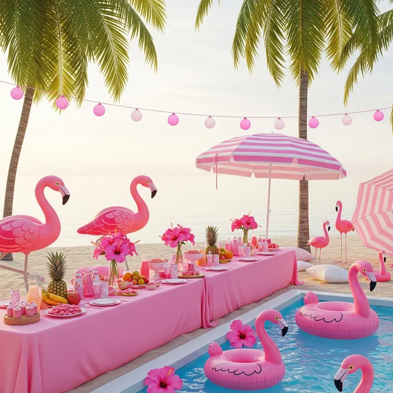 Stand tall with a flamingo-themed party bringing tropical vibes in stunning pink! Decorate with inflatable flamingos, palm fronds spray-painted pink, and tropical flowers in various pink shades. Create a tiki bar serving pink tropical drinks: flamingo punches, pink piña coladas, and watermelon margaritas. Set up lawn flamingo ring toss, flamingo limbo, and "pin the beak on the flamingo" games. Serve tropical foods with pink elements: pink-frosted coconut shrimp, watermelon salads, and pink pineapple upside-down cake. Include a flamingo pose photo contest encouraging guests to perfect their one-legged stance. Play steel drum music or tropical house maintaining island vibes. This playful theme combines pink with vacation feelings creating a mini tropical escape perfect for summer celebrations.