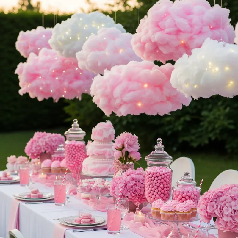Float away on clouds of spun sugar with a whimsical cotton candy themed celebration! Rent or buy a cotton candy machine as your party centerpiece, offering various flavors beyond traditional pink. Create cloud decorations using pink and white balloons clustered together hanging from the ceiling. Serve cloud-inspired treats: meringues, pink marshmallows, and strawberry milk in vintage milk bottles. Set up a cotton candy cocktail bar where bartenders top drinks with cotton candy that dissolves dramatically. Include carnival games with pink prizes maintaining the fairground atmosphere. Provide cotton candy in clear bags as party favors guests can take home. This sweet theme appeals to all ages while creating that nostalgic carnival magic everyone loves.