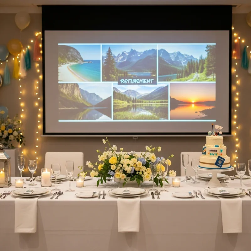 Compile heartfelt messages from colleagues, clients, friends, and family who couldn't attend into a surprise video tribute that becomes the party's emotional centerpiece. Secretly contact people from throughout the retiree's career, including former colleagues, mentees they've guided, and clients whose lives they've impacted. Ask each person to record a short message sharing favorite memories, expressing gratitude, or offering retirement wishes and advice for this new chapter. Edit these clips into a professional-looking video with music, photos, and title cards that tell the complete story of their career impact. Reveal the video during the party's peak moment, dimming lights for a theater-like experience that focuses all attention on celebrating the retiree. This digital keepsake becomes a treasure they can watch whenever they need reminders of how much they're valued and missed.
