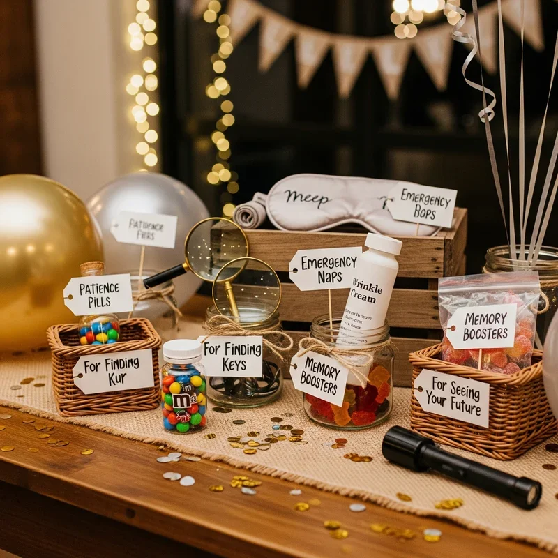 Create an interactive gift-giving experience where guests build personalized retirement survival kits filled with humorous and practical items for the retiree's new lifestyle. Set up a station with various supplies: reading glasses, golf balls, garden tools, puzzle books, restaurant gift cards, and joke items like "Monday alarm clock disabler" certificates. Provide decorated boxes or bags where guests can assemble custom kits, adding personal notes explaining why each item will be essential for retirement success. Include a checklist of suggested items ranging from serious (hobby supplies) to silly (anti-boredom emergency provisions), inspiring creative combinations. Display completed kits throughout the party, allowing everyone to see the creative and funny combinations others assembled. This activity replaces traditional gift-opening with an engaging experience that produces multiple meaningful presents while entertaining party guests throughout the event.