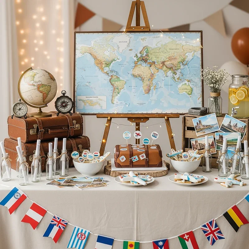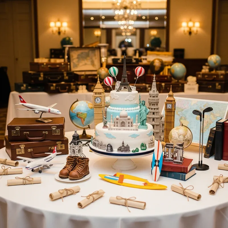 Transform your venue into a departure lounge for the retiree's next life adventure with a travel-themed celebration that captures their wanderlust spirit. Decorate with vintage suitcases, maps, globes, and destination posters representing places they've dreamed of visiting during retirement. Create passport-style invitations and have guests "check in" at different country stations featuring themed food, drinks, and activities from around the world. Set up a photo booth with props from various destinations: safari hats, Hawaiian leis, Parisian berets, and tropical sunglasses for memorable snapshots. Include a large world map where guests can pin locations they recommend the retiree visit, complete with personal travel tips written on luggage tags. Design the cake like a suitcase or globe, and give out compass keychains or luggage tags as party favors. This theme perfectly captures the freedom and exploration that retirement promises.