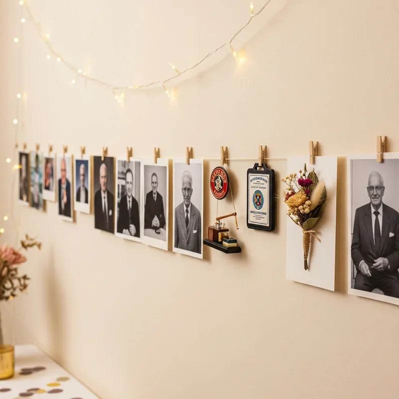 Transform your party space into a visual journey through the retiree's career by creating an elaborate timeline that chronicles their professional evolution. Start with their first day photo and wind through decades of achievements, funny office moments, and milestone celebrations using photos, newspaper clippings, and memorable quotes from colleagues. String the timeline along walls using twine and clothespins, or create standing displays that guests can walk through like a museum exhibition. Include artifacts like old ID badges, business cards from different positions, and copies of significant projects they spearheaded over the years. Add interactive elements by placing blank cards where guests can add their own memories or photos to the timeline during the party. This nostalgic centerpiece becomes both decoration and entertainment, sparking conversations as guests discover shared memories and learn new stories about the retiree's journey.