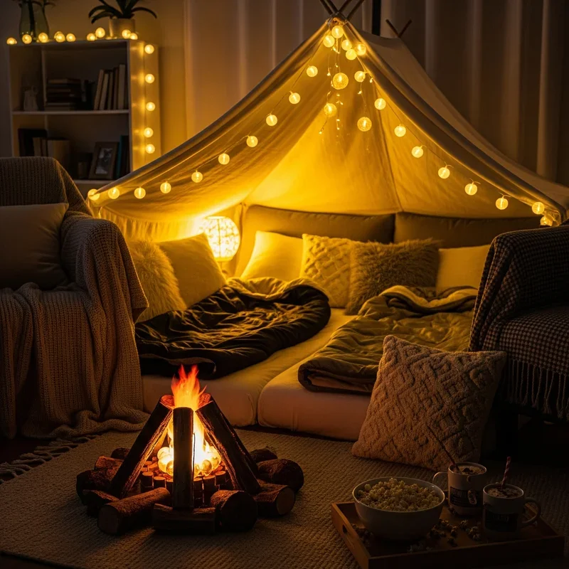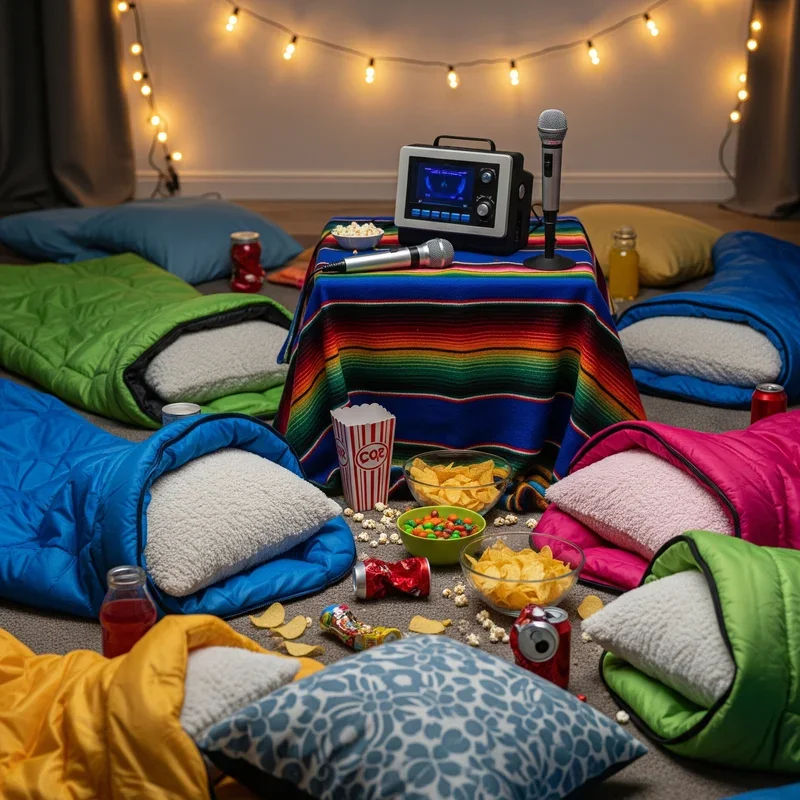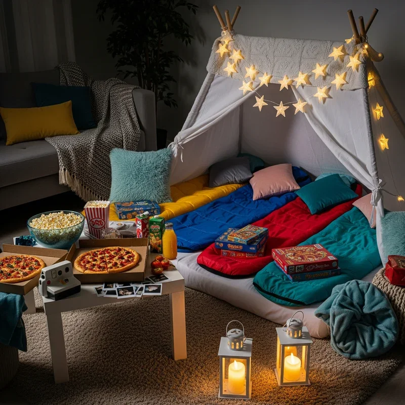 Bring the great outdoors inside where s'mores meet comfort and ghost stories don't require bug spray! Set up tents or create camping areas with sleeping bags arranged in circles. Use battery-powered lanterns or string lights shaped like campfires for authentic ambiance without safety concerns. Make s'mores using candles or microwave methods, tell ghost stories with flashlights, and play camping games like charades or twenty questions. Create nature sounds playlists and project stars onto the ceiling for full immersion. Include camping snacks like trail mix bars where guests create custom combinations. The indoor setting eliminates weather worries while maintaining that adventurous camping spirit. This theme naturally incorporates multiple activities from storytelling to sing-alongs while providing defined sleeping spaces that feel special yet comfortable.