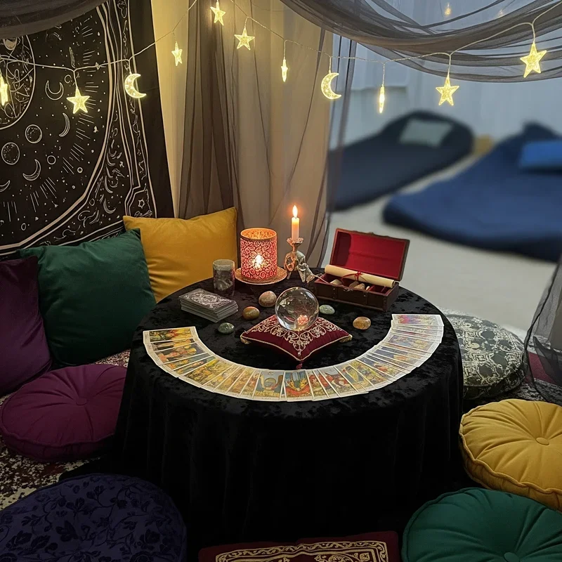 Add mystery and intrigue with a mystical corner where futures are revealed and secrets of the universe unfold! Set up a cozy area with scarves, twinkle lights, and cushions creating an authentic fortune teller's tent. Provide tarot cards, palm reading guides, crystal balls (or snow globes), and fortune cookies for various divination methods. Teach basic palm reading lines or simple tarot spreads that focus on fun rather than serious predictions. Include Magic 8 balls, cootie catchers, and MASH games for nostalgic fortune-telling fun. The intimate setting encourages one-on-one bonding while waiting turns builds anticipation. Create personalized fortune scrolls as party favors guests can keep. This quieter activity provides perfect balance to high-energy games while the mysterious atmosphere adds to the special feeling of staying up late exploring the unknown.