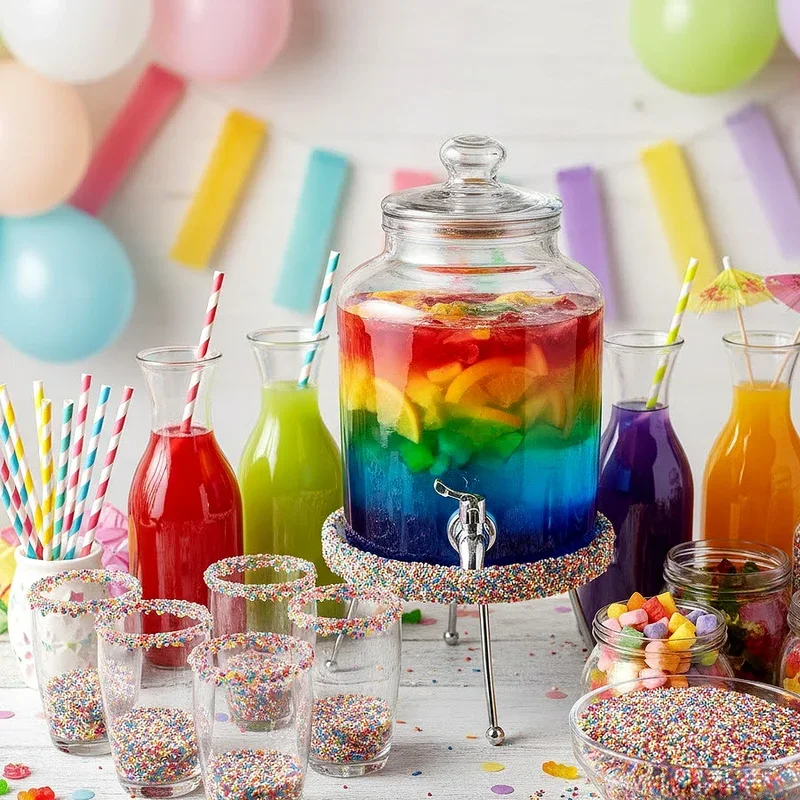 Keep your guests refreshed with a vibrant drink station that matches your sprinkle party's colorful aesthetic. Create a rainbow effect by offering beverages in different colors using natural ingredients or food coloring. Set up glass dispensers filled with pink lemonade, blue raspberry punch, orange juice, and lime sherbet punch. Rim glasses with corn syrup and dip them in coordinating colored sugars or sprinkles for an extra special touch. Include fun straws, drink umbrellas, and fresh fruit garnishes. Label each drink with creative names like "Sprinkle Sparkle Punch" or "Rainbow Refresher." Don't forget non-alcoholic options for all ages and provide both cold and room temperature choices. Add ice buckets decorated with ribbons and ensure you have plenty of napkins nearby for any spills.