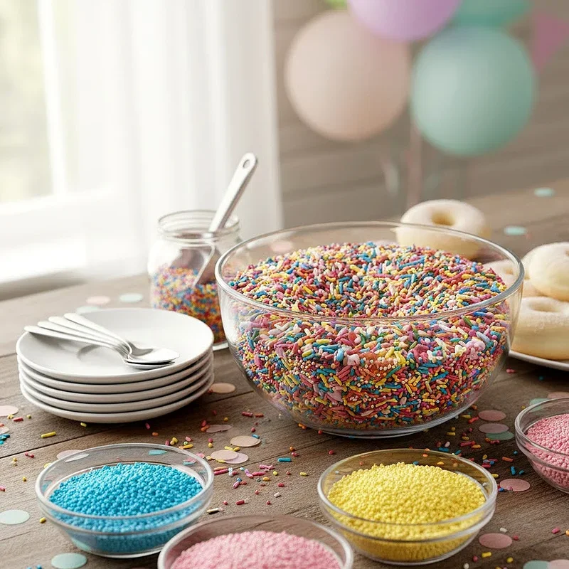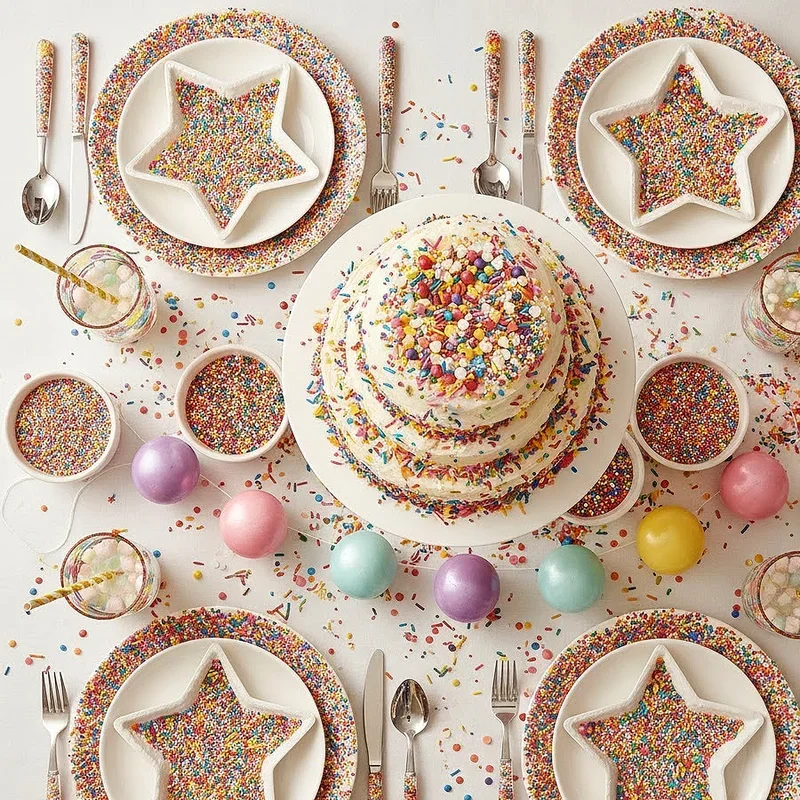 Transform your dining tables into sprinkle wonderlands with thoughtfully designed place settings that delight guests from the moment they sit down. Use white or pastel tablecloths as your base, then layer with rainbow-colored runners or placemats. Fold napkins in bright colors and secure them with sprinkle-filled clear ornaments as napkin rings. Place cards can be mini donuts with guests' names written in icing or attached tags. Scatter edible sprinkles directly on the table for a whimsical touch, or use confetti that matches your color scheme. Center each table with low floral arrangements incorporating colorful flowers that mirror sprinkle colors. Add battery-operated string lights woven between centerpieces for extra sparkle. These details show your attention to creating a cohesive theme while making each guest feel special and welcomed at your celebration.