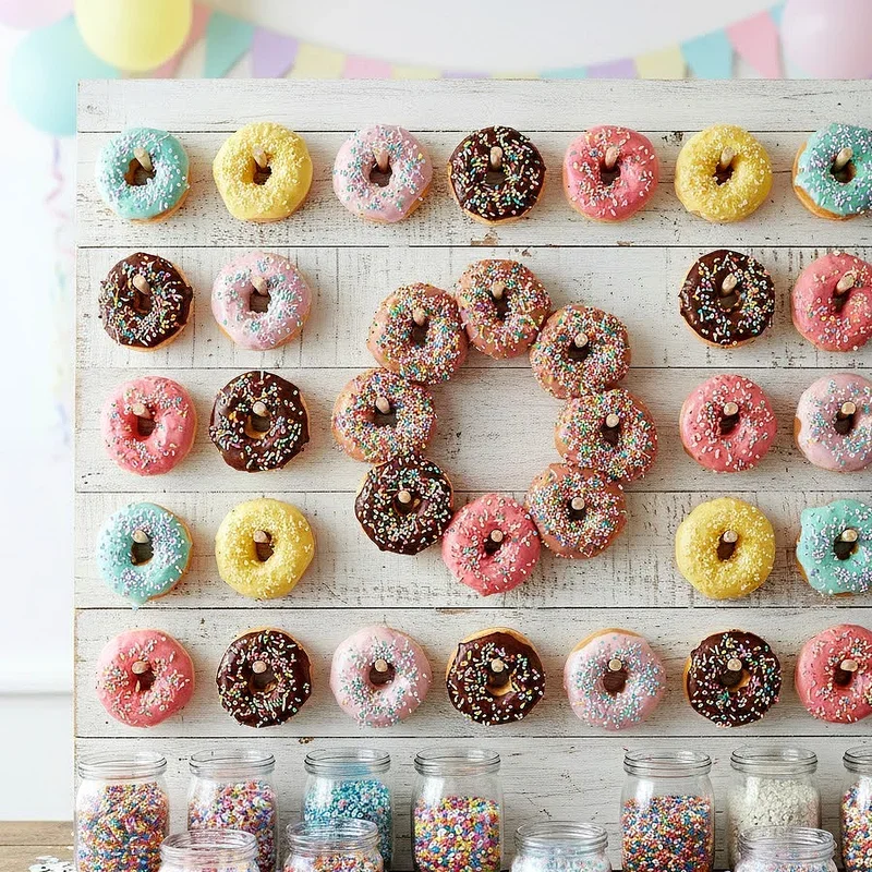 Create an Instagram-worthy focal point with a donut wall that combines function with fabulous visual appeal. Build or rent a pegboard painted in white or a pastel shade, then arrange glazed donuts in a rainbow pattern across the board. Mix different donut varieties including classic glazed, chocolate-frosted, and especially those covered in colorful sprinkles. Position the wall at an angle that makes it easy for guests to grab their treats without everything tumbling down. Add a sign reading "Donut Mind If I Do" or another playful phrase. Include napkins and small plates nearby, and consider having tongs available for guests who prefer not to touch the display directly. This interactive dessert station serves as both decoration and delicious snack, giving your party that extra special touch everyone will remember.