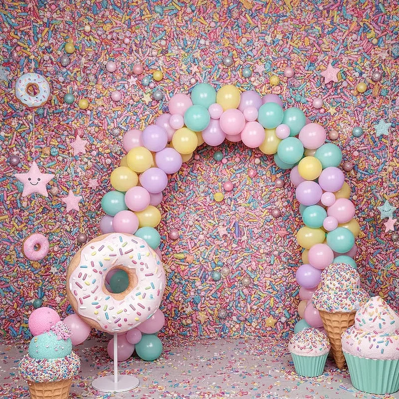 Transform your party space with a stunning balloon garland that mimics the look of colorful sprinkles scattered across the room. Start by selecting balloons in various sizes and colors that match rainbow sprinkles: pink, yellow, mint green, orange, and blue work beautifully together. You'll need fishing line, a balloon pump, and about fifty balloons for a six-foot garland. Create visual interest by clustering different colored balloons together rather than spacing them evenly. Add metallic balloons for extra sparkle, and consider incorporating clear balloons filled with actual sprinkles for a unique touch. Hang your garland above the dessert table or use it as a backdrop for photos where guests can capture memories.