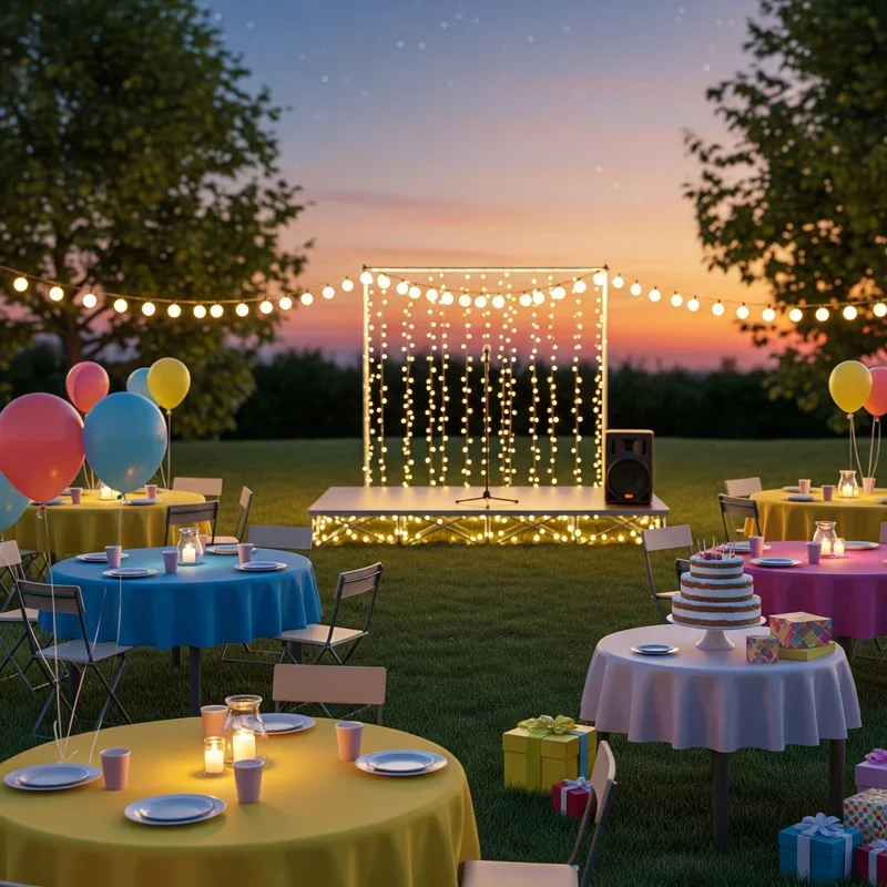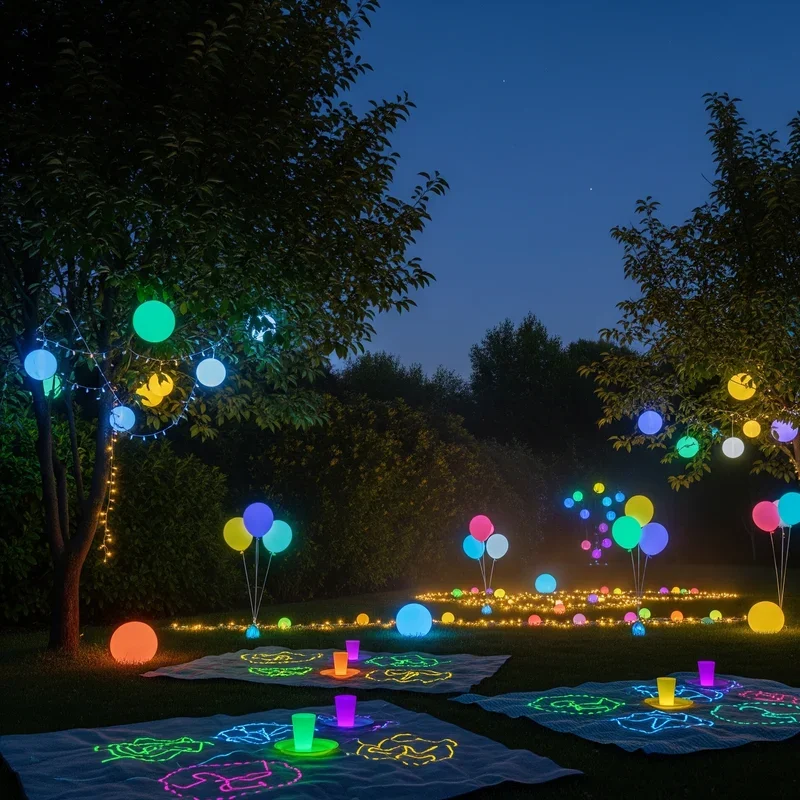As darkness falls, watch your party transform into a glowing wonderland that turns night into the main attraction! Start the party at dusk, providing glow sticks, LED accessories, and neon face paint as guests arrive. Set up black lights around your space to make white and neon colors pop dramatically. Create glowing drinks using tonic water that naturally fluoresces under black light. Organize glow-in-the-dark games like ring toss with glowing rings, volleyball with a light-up ball, or hide-and-seek with glowing wristbands. Decorate with glow-in-the-dark stars, paint regular items with phosphorescent paint, and hang glowing orbs from trees. The transition from daylight to darkness builds anticipation, and the glowing elements create an otherworldly atmosphere that feels like celebrating in space or underwater.