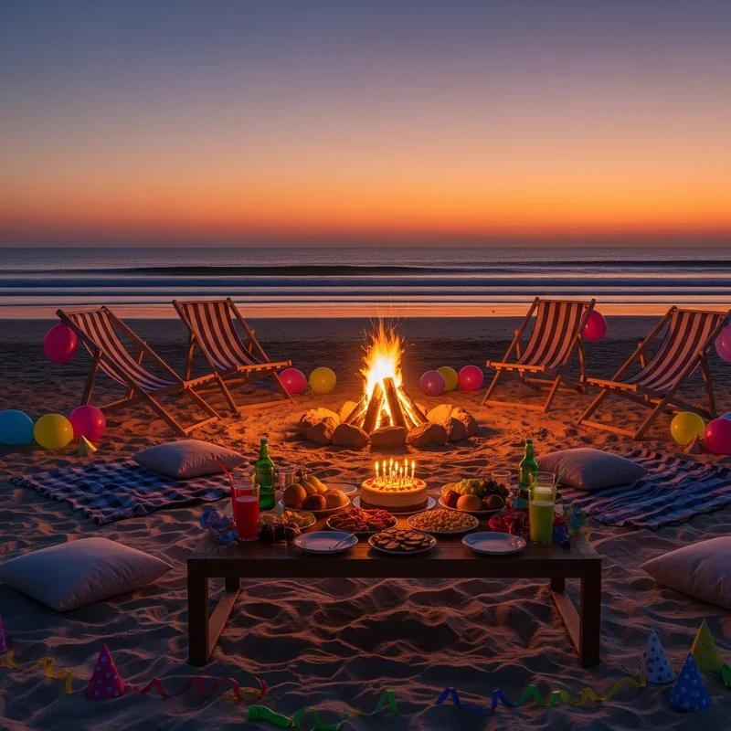 Nothing beats celebrating as the sun sets over the ocean with a crackling bonfire lighting up happy faces! Reserve a beach spot that allows fires and arrive early to claim the perfect location. Bring comfortable seating like beach chairs, blankets, and cushions arranged in a circle around the fire pit. Pack a cooler with drinks and prepare foil packet dinners that cook right in the coals. Don't forget the s'mores supplies and hot dogs for roasting! Include beach games like frisbee, volleyball, or sandcastle competitions while there's still daylight. As darkness falls, break out guitars for singalongs or share stories around the flickering flames. The natural ambiance of waves crashing and stars appearing creates pure magic. This intimate yet adventurous celebration combines the best of summer elements into one unforgettable evening.