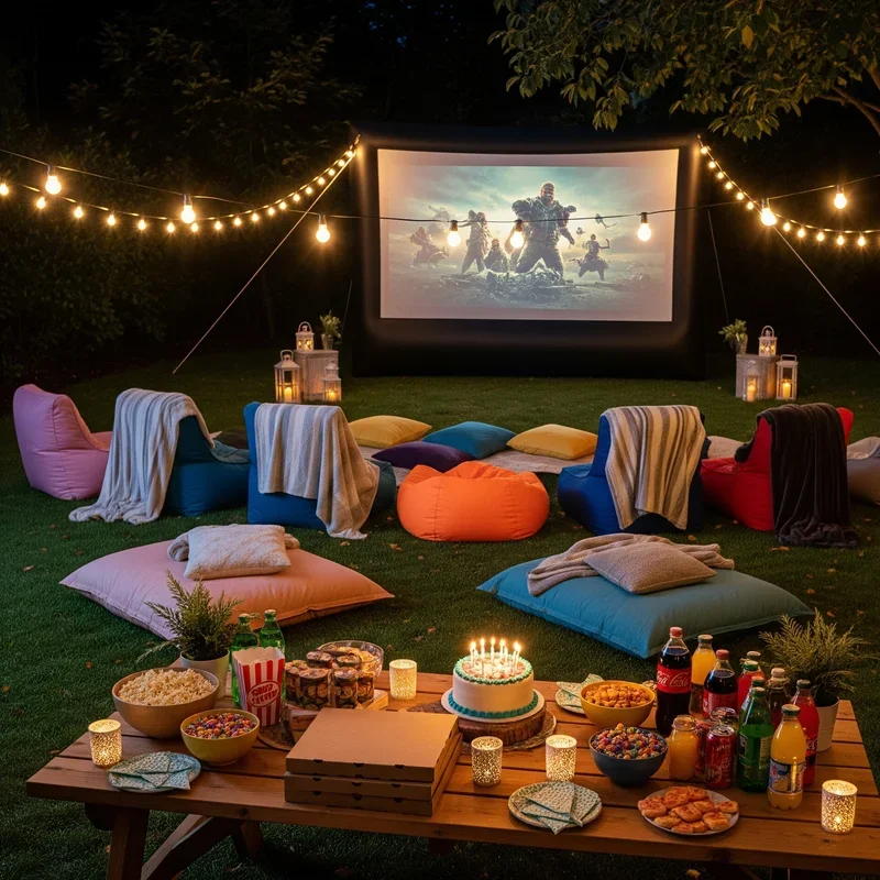 Create a cinematic experience under the stars with an outdoor movie marathon featuring your teen's favorite films or binge-worthy series. Arrange cozy seating areas with bean bags, blankets, pillows, and air mattresses that encourage lounging and socializing throughout the screening. String fairy lights around the viewing area and set up a legitimate concession stand with popcorn machine, candy display, and specialty drinks named after movie characters. Let the birthday teen curate the lineup but include interactive elements like movie trivia between films or costume contests for themed viewing parties. Provide individual snack boxes to minimize disruption during films while maximizing the authentic theater experience everyone craves. Add fun elements like providing scorecards for rating movies or having guests predict plot twists for prizes. This relaxed format allows natural conversation flow while providing entertainment structure that prevents awkward party lulls.